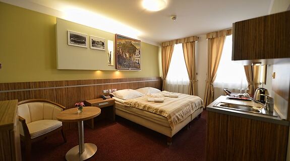 PokojeV jednom z 21 pokojů, k jejichž vybavení patří kuchyňský kout, lednička a mikrovlnná trouba, se budete cítit jako doma. Bezdrátový internet zdarma vám zajistí spojení se světem a televize s plochou obrazovkou dobrou zábavu. Další užitečné vybavení a služby: telefon, vestavěný trezor a psací stůl.