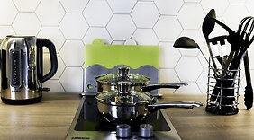 部屋全 85 室あるそれぞれ異なるインテリアのが施された客室には、冷蔵庫、コンロなどが備わったキッチンがあり、ゆったりおくつろぎいただけます。薄型テレビでデジタルの番組をご覧いただけるほか、WiFi (無料)などもご利用いただけます。セーフティボックス (ノートパソコン収納可能)、デスクの他に、市内通話 (無料)付きの電話をご利用いただけます。