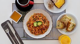 レストランお食事はレストランでお召し上がりください。客室から、このゲストハウスのルームサービス (営業時間限定)をご利用いただくこともできます。1 日の終わりは、バー / ラウンジで 1 杯飲んで楽しみましょう。オーダー形式の朝食を毎日 8:30 ~ 12:30 までお召し上がりいただけます (有料)。