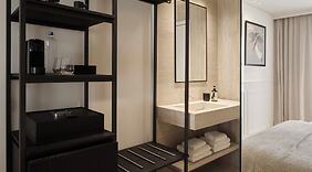 部屋全部で 56 ある冷房完備の客室にはエスプレッソマシン、薄型テレビなどが備わっており、ゆっくりおくつろぎいただけます。WiFi (無料)をお使いいただけるほか、衛星放送の番組をご覧いただけます。シャワーのある専用バスルームには、レインフォールシャワー、バスアメニティ (無料)が備わっています。セーフティボックス (ノートパソコン収納可能)をご利用いただけ、ハウスキーピング サービスは、毎日行われます。